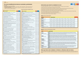 Este documento presenta un test de intereses vocacionales dividido en 80 preguntas sobre diferentes actividades. El objetivo es que la persona marque si le interesa o no cada actividad para identificar sus áreas de mayor interés. Luego en tablas se muestran las áreas profesionales agrupadas por afinidad temática y el puntaje obtenido en cada una para guiar la elección vocacional. Se invita a reflexionar sobre los resultados considerando también la oferta local de estudios.