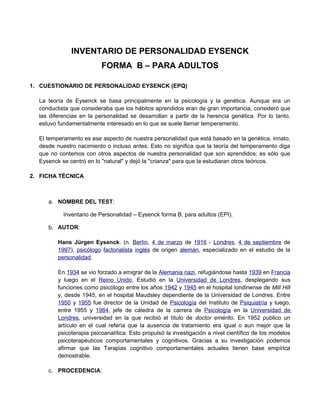 Este documento proporciona una descripción detallada del Inventario de Personalidad Eysenck Forma B para adultos. Evalúa las dimensiones de introversión-extroversión, neurotismo y una escala de mentiras. Proporciona información sobre el autor, objetivo, administración, puntajes y uso del inventario para evaluar cuatro tipos de temperamento: melancólico, colérico, sanguíneo y flematico.
