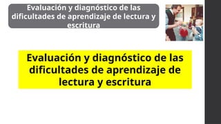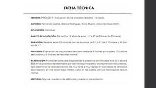 El documento detalla la evaluación y diagnóstico de las dificultades de aprendizaje en lectura y escritura a través de las baterías PROLEC-R y PROESC, basadas en modelos cognitivos. PROLEC-R se enfoca en identificar las dificultades específicas en los procesos lectores, mientras que PROESC evalúa los componentes implicados en la escritura, desde la planificación hasta la ortografía. Ambas herramientas son útiles en contextos educativos y clínicos para detectar y abordar problemas relacionados con la dislexia y otros trastornos de aprendizaje.