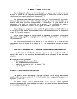 Este documento describe la Prueba Exploratoria de Escritura Cursiva (P.E.E.C.), la cual evalúa el desarrollo de la escritura cursiva en términos de rapidez y calidad de copia. La prueba consta de tres subtests: velocidad normal, velocidad rápida y calidad de copia. Proporciona información sobre las habilidades básicas de escritura y permite identificar deficiencias para guiar el desarrollo o rehabilitación. Se aplica a estudiantes de primer a cuarto gra