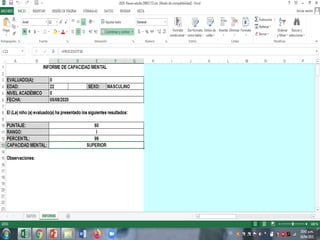 El documento describe el Test de Matrices Progresivas de Raven, un test colectivo de inteligencia no verbal. Fue creado en 1938 por J.C. Raven para evaluar habilidades de razonamiento y resolución de problemas mediante la selección de piezas que completan matrices incompletas. Se aplica individualmente o a grupos y mide la capacidad de educción, proporcionando un indicador general del rendimiento intelectual expresado en percentiles.