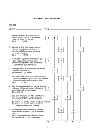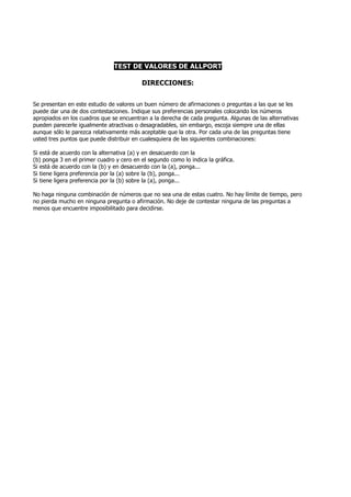 Este documento presenta las instrucciones para completar un test de valores de Allport. El test contiene 30 preguntas con dos opciones cada una (a y b). Se pide al participante asignar puntos de 1 a 3 a cada opción dependiendo de su grado de acuerdo o desacuerdo. La segunda parte del test presenta situaciones con 4 respuestas posibles cada una, solicitando ordenarlas de la más preferida (4 puntos) a la menos preferida (1 punto). El objetivo es evaluar las preferencias y valores del participante.