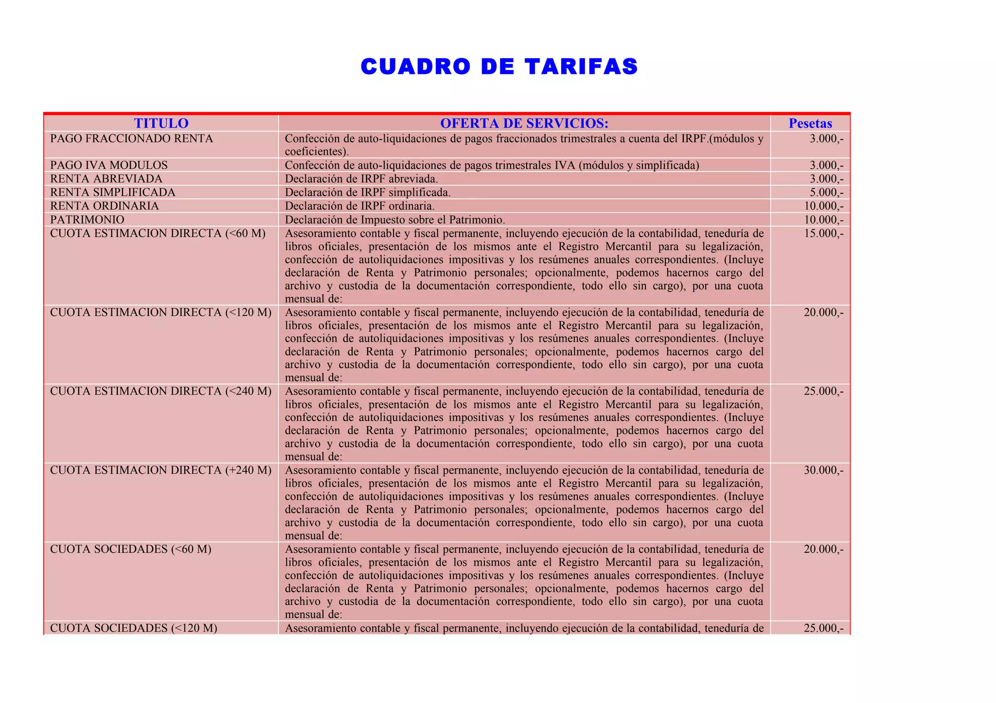 Este documento presenta una tabla de tarifas para diferentes servicios de asesoramiento fiscal y contable. Incluye precios para la preparación de declaraciones de impuestos, cuotas mensuales para servicios contables y fiscales permanentes que varían según el volumen de negocio de la empresa, y tarifas para trámites relacionados con los empleados como la gestión de nóminas y altas en la seguridad social.