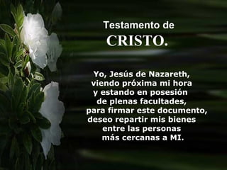 Este documento es un testamento de Jesús de Nazareth en el que reparte simbólicamente sus bienes y enseñanzas entre la humanidad, enfatizando la importancia de la humildad, el amor y el servicio. A través de diversos símbolos como la estrella, el pesebre y la cruz, invita a la solidaridad y a cargar con las responsabilidades del camino espiritual. Además, ofrece su compañía y apoyo, destacando que su vida es un legado que trasciende el tiempo.