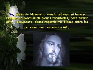 En su testamento, Jesús de Nazareth desea compartir sus bienes y enseñanzas con la humanidad, ofreciendo símbolos como la estrella, el pesebre y la cruz, que reflejan su mensaje de amor y servicio. Invita a las personas a adoptar actitudes de humildad, fraternidad y perdón, y se compromete a acompañarles en su camino espiritual. Su legado se centra en la importancia de la unidad, el amor y la vida compartida.