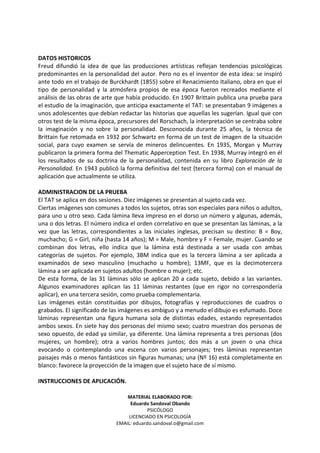 Este documento proporciona información sobre el Test de Apercepción Temática (TAT), incluyendo su autor original, edades de aplicación, materiales necesarios, administración, áreas evaluadas e instrucciones. El TAT consiste en 31 láminas ambiguas que estimulan la imaginación del sujeto para construir historias, permitiendo explorar su personalidad de manera profunda y dinámica. Es uno de los tests psicológicos más utilizados junto con el Rorschach y el MMPI.