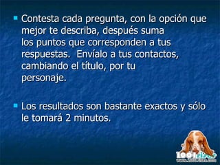 Este documento presenta un test de personalidad de 10 preguntas para determinar a qué personaje de caricatura la persona se parece más, basado en un análisis de las personalidades de populares personajes de caricaturas. Los participantes deben responder cada pregunta eligiendo una opción, sumar los puntos de sus respuestas y enviar el correo electrónico a otros con su puntaje en el asunto para revelar su personaje. El documento también incluye una breve descripción del carácter de cada personaje posible según el puntaje obtenido.