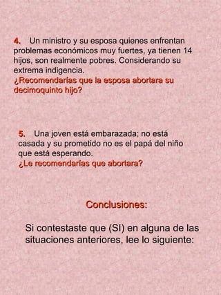 Este documento presenta cinco casos de embarazo y pregunta si se recomendaría el aborto en cada situación. Luego, revela que personas importantes como Beethoven, Ethel Walters, el Papa Juan Pablo II, Juan Wesley y Jesucristo podrían haber sido abortados si se hubiera recomendado el aborto en circunstancias similares a las presentadas en los cinco casos. El documento concluye instando a los lectores a no dejarse engañar por los "propagandistas de la muerte" y a proteger el derecho a