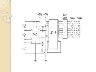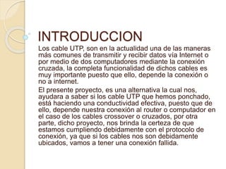 Este documento describe un tester de cable UTP. Explica que los cables UTP son comúnmente usados para transmitir datos entre computadoras y a Internet. Luego, detalla los materiales necesarios para construir un circuito que pueda probar si los cables UTP están haciendo una buena conexión. Finalmente, provee instrucciones paso a paso para construir el circuito en una placa y usarlo para probar cables UTP.
