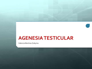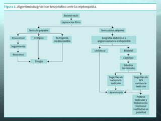 Este documento trata sobre las condiciones de criptorquidia, testículo retráctil y agenesia testicular. Explica que la criptorquidia es la endocrinopatía más frecuente en niños y ocurre cuando al menos un testículo no desciende al escroto. También describe las teorías sobre su patogenia, formas de diagnóstico e implicaciones si no se trata, así como opciones de tratamiento hormonal o quirúrgico. Define la agenesia testicular como la ausencia congénita de uno o amb
