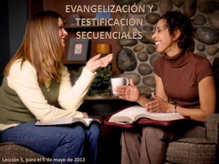 El documento describe las tres fases ideales del proceso de evangelización: 1) Satisfacer las necesidades de la persona, 2) Instruir en los rudimentos básicos de la salvación, y 3) Profundizar en verdades bíblicas más complejas. También enfatiza la importancia de evaluar el crecimiento espiritual de la persona a través de preguntas en cada fase.