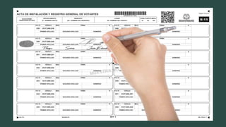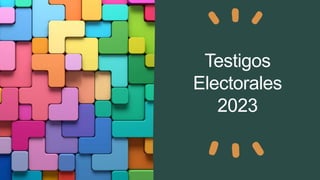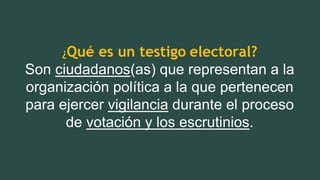 El documento proporciona información sobre los testigos electorales, incluyendo su definición, funciones, quiénes pueden designarlos, el número permitido, sus credenciales, dónde votan, lo que pueden hacer el día de las elecciones para vigilar el proceso de votación y escrutinio, cómo presentar reclamaciones y el proceso de nivelación de mesa.
