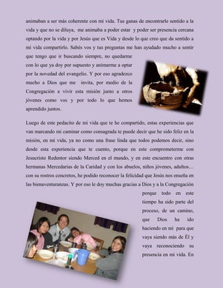 Natalia Rojo, una hermana mercedaria de la caridad, comparte su testimonio vocacional de los últimos catorce años sirviendo a los más pobres en Argentina. Ha pasado mucho tiempo trabajando con ancianos y compartiendo con niños y jóvenes, de quienes ha aprendido mucho. A través de estas experiencias, Natalia ha encontrado felicidad siguiendo a Jesucristo y sintiendo su presencia en los demás. Alienta a los jóvenes a escuchar su vocación interior y dejar que Dios guíe sus vidas.