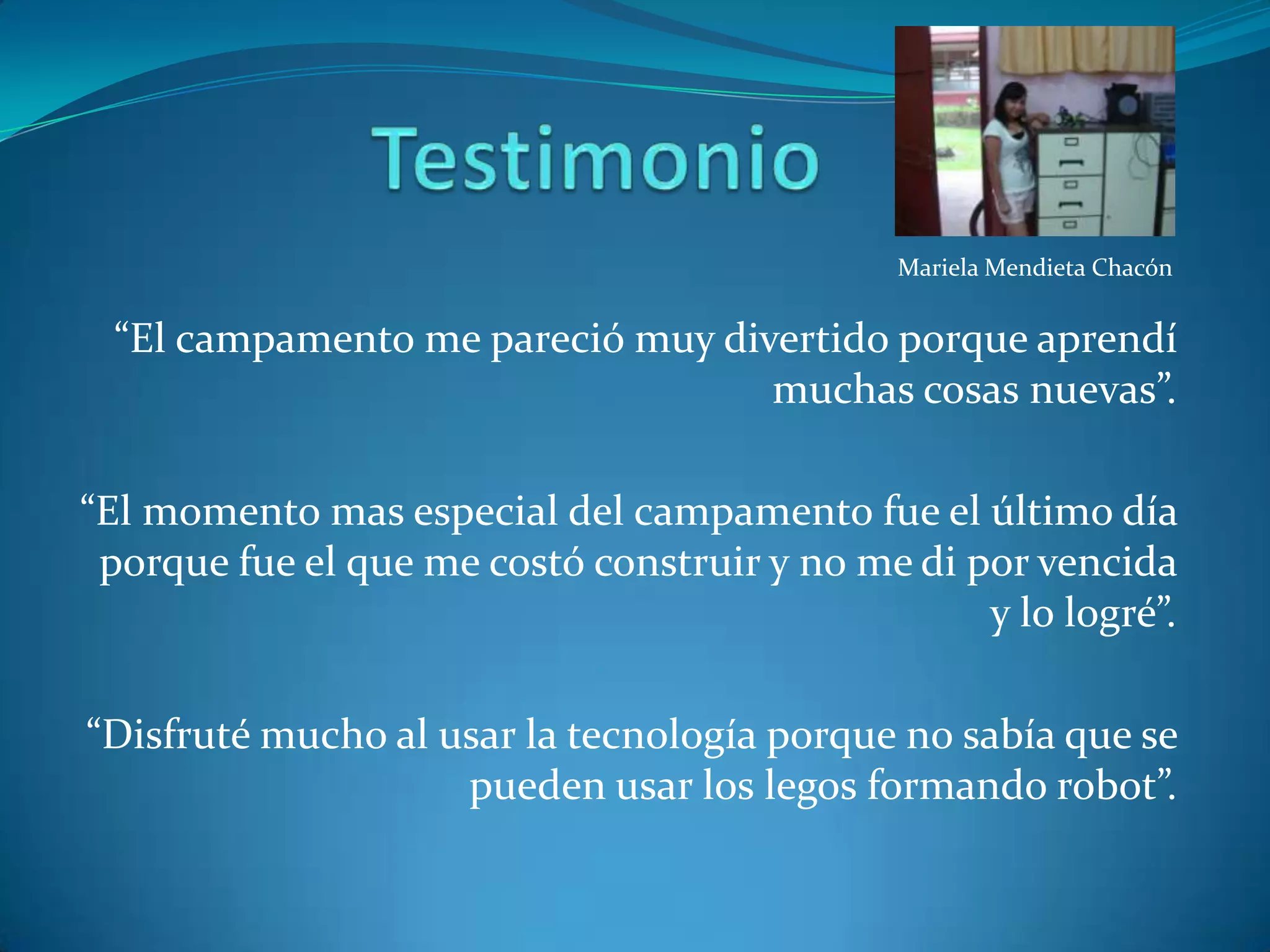 Este documento contiene los testimonios de tres estudiantes sobre su experiencia en un campamento de robótica. Mariela destaca haber aprendido cosas nuevas y haber disfrutado especialmente el último día cuando logró construir su robot. Mónica dice que fue muy divertido y que al principio les fue mal con su araña robot pero al final les fue excelente. Gaudy menciona que le pareció muy interesante porque aprendió más sobre robótica, eligió construir una araña y disfrutó mucho hacer y construir los robots.