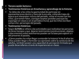 El documento describe estrategias para enseñar historia a niños utilizando testimonios históricos. Sugiere que los niños participen en representaciones que interpreten música y visiten museos para tomar fotos y tarjetas postales. Explica que los testimonios históricos son actividades y objetos del pasado y que estos pueden ayudar a los niños a entender la historia si se les da acceso a periódicos, objetos y fotografías del pasado, además de visitar lugares antiguos. El objetivo es estimular a