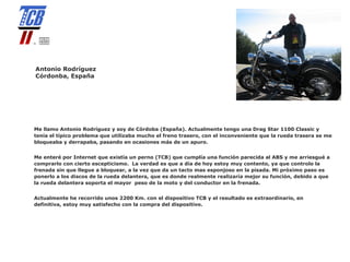 El documento presenta testimonios de motociclistas que han instalado el sistema de frenos TCB en sus motocicletas, destacando su eficacia en la prevención del bloqueo de las ruedas durante frenadas bruscas. Los usuarios, de diferentes trasfondos y experiencias, coinciden en que el dispositivo mejora la seguridad y el control al frenar, y muchos lo recomiendan para motos sin ABS. En general, se menciona que el sistema ha reducido distancias de frenado y ha contribuido a evitar accidentes.