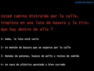 Este documento presenta un test japonés de seis preguntas con cuatro opciones de respuesta cada una. Después de responder, el documento proporciona un breve análisis o resultado para cada pregunta que supuestamente revela aspectos de la personalidad de la persona. Las preguntas tratan sobre temas como encontrar una lata de basura vacía, elegir un paisaje tranquilo, qué hacer si empieza a llover, la forma que tomaría el alma después de la muerte, qué hacer si un dulce no tiene relleno, y si cambiar un pedido de