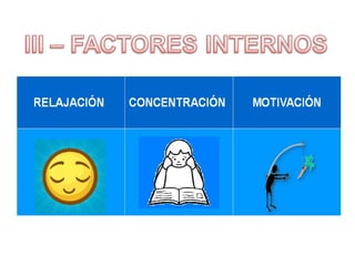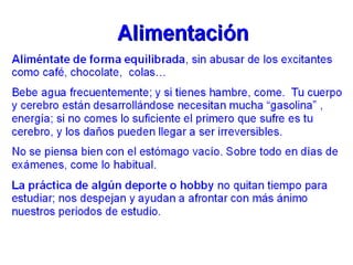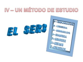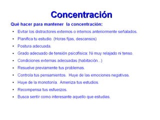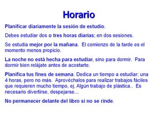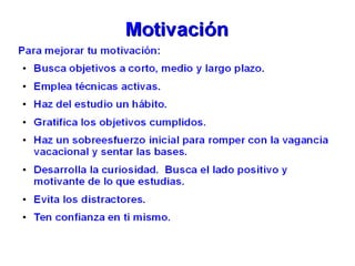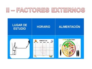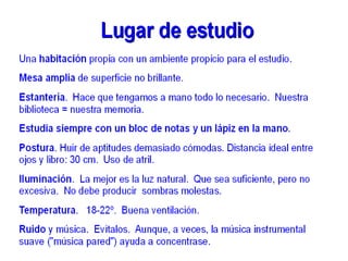 Este documento proporciona consejos y estrategias para estudiar de manera efectiva. Explica factores internos y externos que afectan el estudio, y recomienda métodos como el "ser 3" (subrayar, esquematizar, recitar). También cubre temas como la exploración de apuntes y libros, diferentes tipos de lectura, causas de no entender lo leído, y cómo mejorar la comprensión lectora a través de técnicas como el subrayado, esquematización y resumen. Finalmente, ofrece p