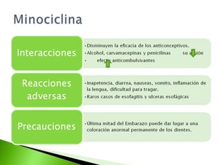 La tetraciclina es un antibiótico de amplio espectro con un núcleo tetracíclico, clasificado en diferentes generaciones según su vida media y farmacocinética. Su mecanismo de acción es bacteriostático, inhibiendo la síntesis de proteínas, y su absorción y distribución varían según el tipo de tetraciclina. Se utiliza en diversas infecciones y se presenta en múltiples formas, incluyendo pomadas y cápsulas, con pautas específicas de dosificación para adultos y niños.