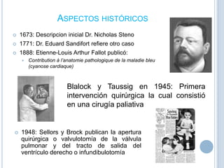 La tetralogía de Fallot es una cardiopatía congénita que consiste en una comunicación interventricular, mala alineación del septo interventricular, acabalgamiento de la aorta y obstrucción del tracto de salida del ventrículo derecho. El diagnóstico se realiza mediante ecocardiograma y el tratamiento es quirúrgico para cerrar la comunicación y corregir la obstrucción pulmonar.