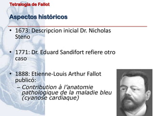 La tetralogía de Fallot comprende 4 defectos congénitos del corazón: comunicación interventricular, obstrucción del tracto de salida del ventrículo derecho, dextroposición de la aorta y hipertrofia del ventrículo derecho. El tratamiento quirúrgico incluye cirugía paliativa en pacientes menores de 1 año y corrección completa en pacientes mayores de 1 año asintomáticos con anatomía favorable. La cirugía mejora el pronóstico pero existen riesgos de complicaciones tardías como insuf