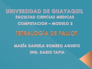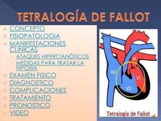 La cardiopatía cono truncal es una anomalía congénita caracterizada por la desviación anterior del tabique infundibular, lo que causa estenosis pulmonar y comunicación interventricular. Puede causar cianosis, crisis hipercianóticas y complicaciones como trombosis cerebrales. El diagnóstico se realiza mediante ecocardiograma y cateterismo cardiaco. El tratamiento quirúrgico consiste en corregir la obstrucción del tracto de salida ventricular derecho y cerrar la comunicación interventricular.