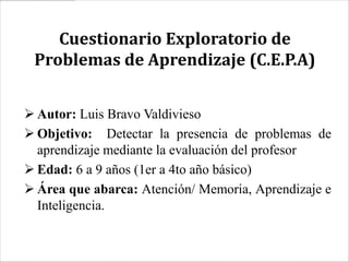 Este documento resume las características de varios test psicopedagógicos utilizados para evaluar diversas áreas como atención, memoria, aprendizaje, inteligencia, lenguaje, lectura, escritura, matemáticas y desarrollo psicomotor en niños de 2 a 16 años. Los tests miden habilidades a través de pruebas como la percepción, razonamiento, funciones cognitivas y procesos lingüísticos.