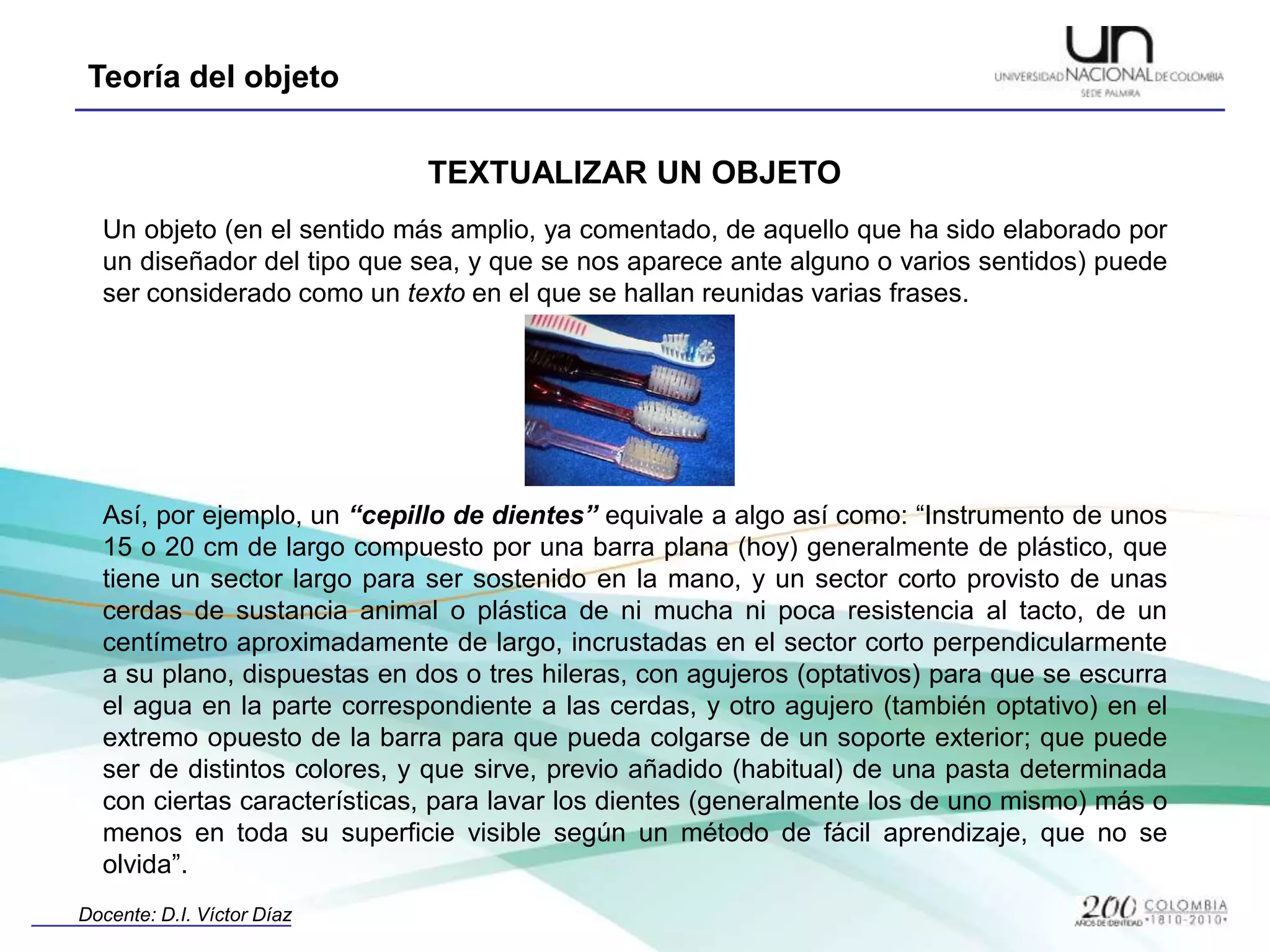 El documento describe cómo un objeto puede considerarse como un texto, con el ejemplo de un cepillo de dientes. Se detalla una larga descripción del cepillo que cubre sus características físicas y su función. Textualizar un objeto significa describirlo en forma de texto para cubrir sus distintos aspectos y su función como utensilio, desde las perspectivas del diseñador, fabricante y usuario.