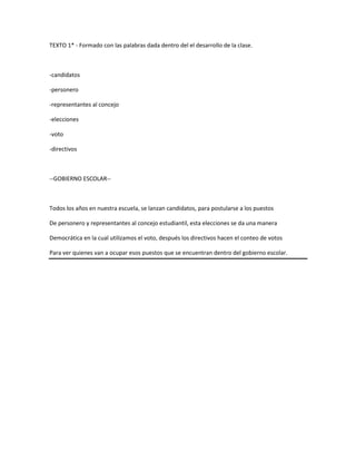 El documento habla sobre el proceso de elecciones en una escuela para elegir a los representantes del gobierno estudiantil. Los estudiantes postulan su candidatura para los cargos de personero y representantes al concejo, luego se lleva a cabo la votación de manera democrática. Después, los directivos cuentan los votos para determinar quiénes ocuparán esos puestos dentro del gobierno escolar.