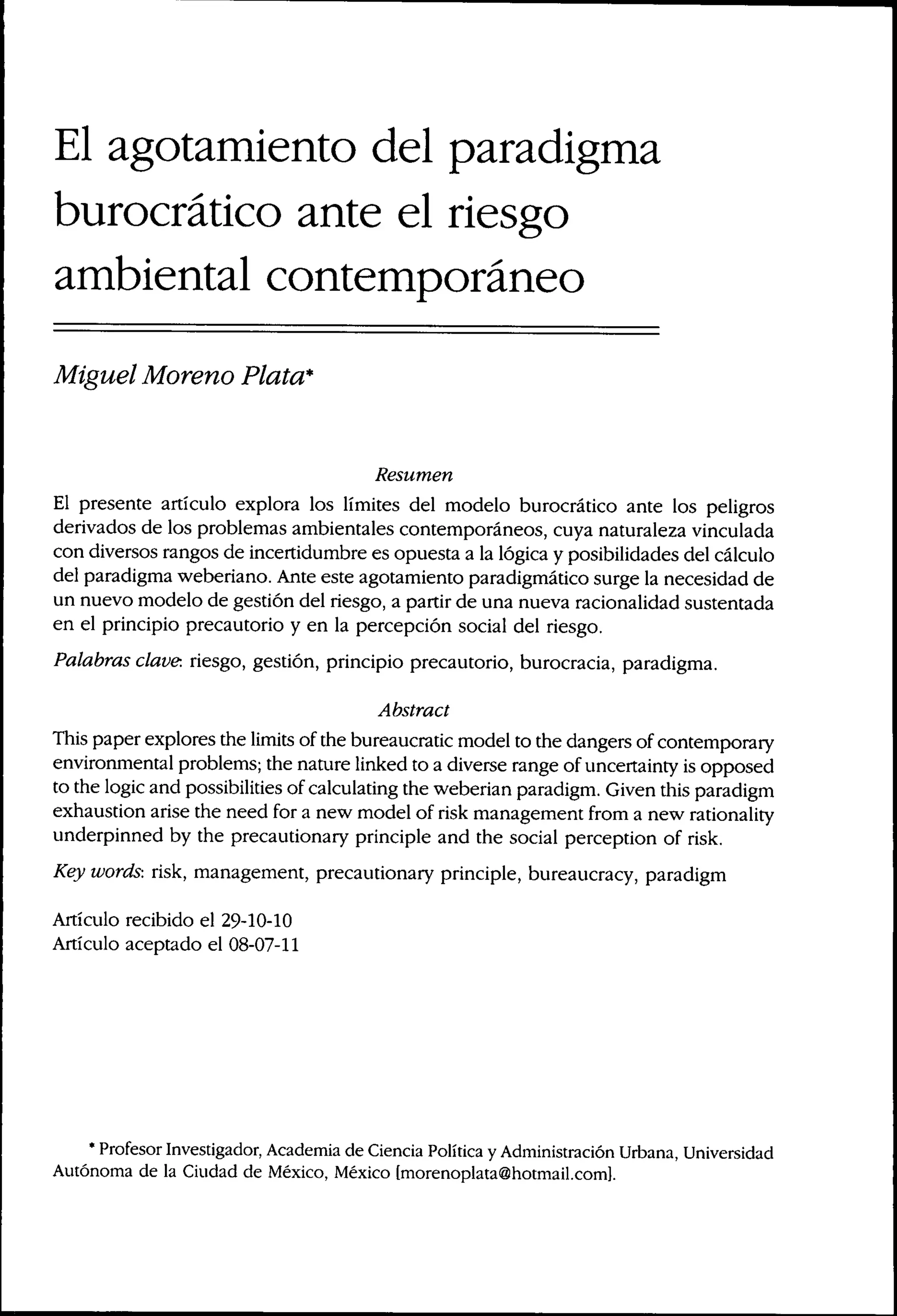 Este documento explora los límites del modelo burocrático para gestionar los riesgos ambientales contemporáneos, los cuales están ligados a gran incertidumbre. Problemas como el cambio climático y la pérdida de biodiversidad no pueden ser calculados con precisión debido a factores desconocidos. Por lo tanto, se necesita un nuevo paradigma basado en el principio precautorio que reconozca los límites del conocimiento científico y la percepción social del riesgo.