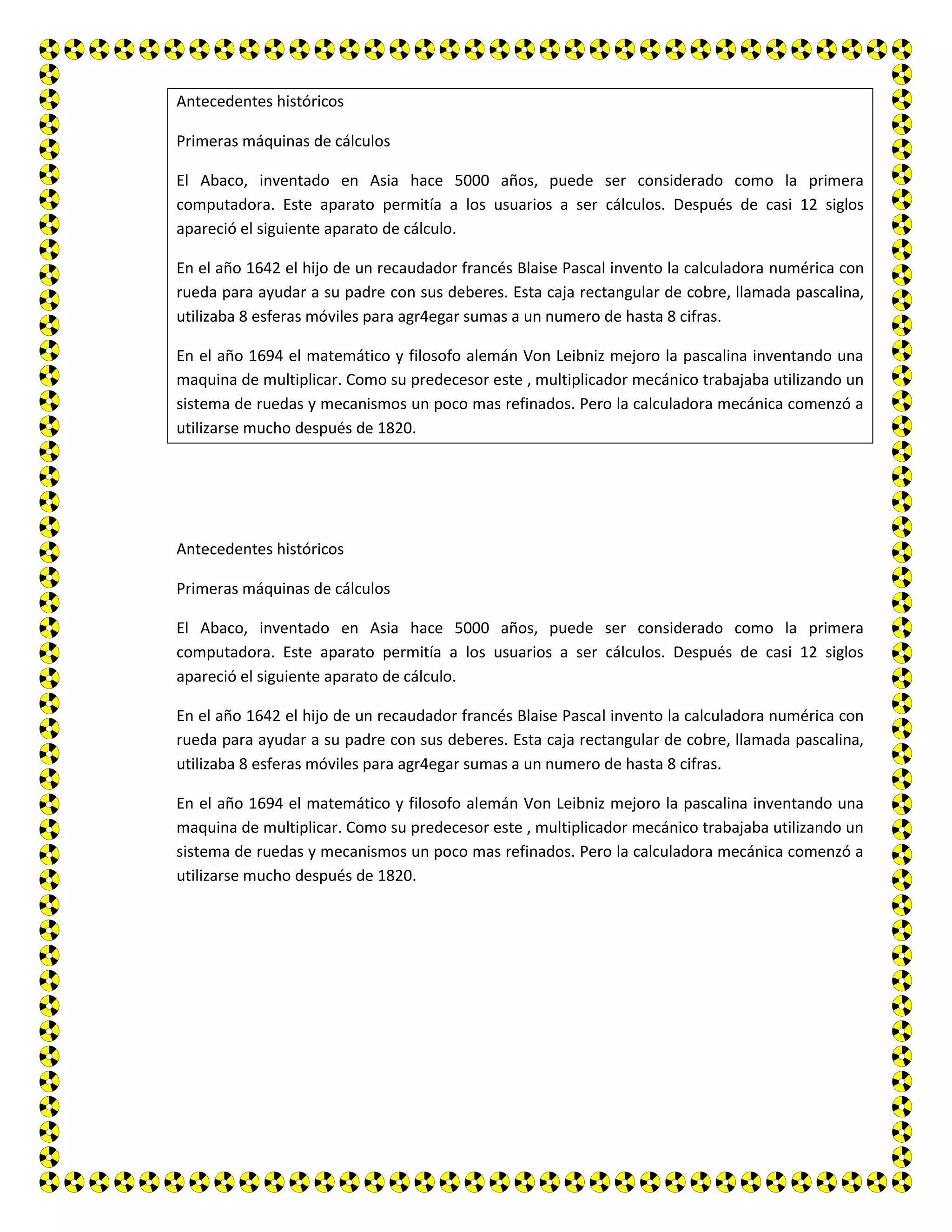 El abaco, inventado en Asia hace 5000 años, fue la primera computadora al permitir realizar cálculos. En 1642, Blaise Pascal inventó la calculadora numérica con rueda para ayudar a su padre, utilizando 8 esferas móviles para sumar números de hasta 8 cifras. En 1694, Von Leibniz mejoró esta máquina al inventar una máquina de multiplicar que funcionaba con ruedas y mecanismos refinados.