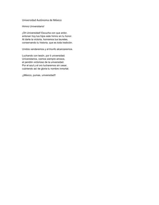 El himno de la Universidad Autónoma de México expresa el orgullo y la devoción de sus estudiantes hacia la institución. Los estudiantes prometen luchar con tesón y unidad para defender los colores azul y oro de la universidad, honrar su historia y tradiciones, y cubrir su nombre de gloria. El himno concluye gritando "¡¡México, pumas, universidad!!" para enfatizar el orgullo nacional y la lealtad a la escuela.