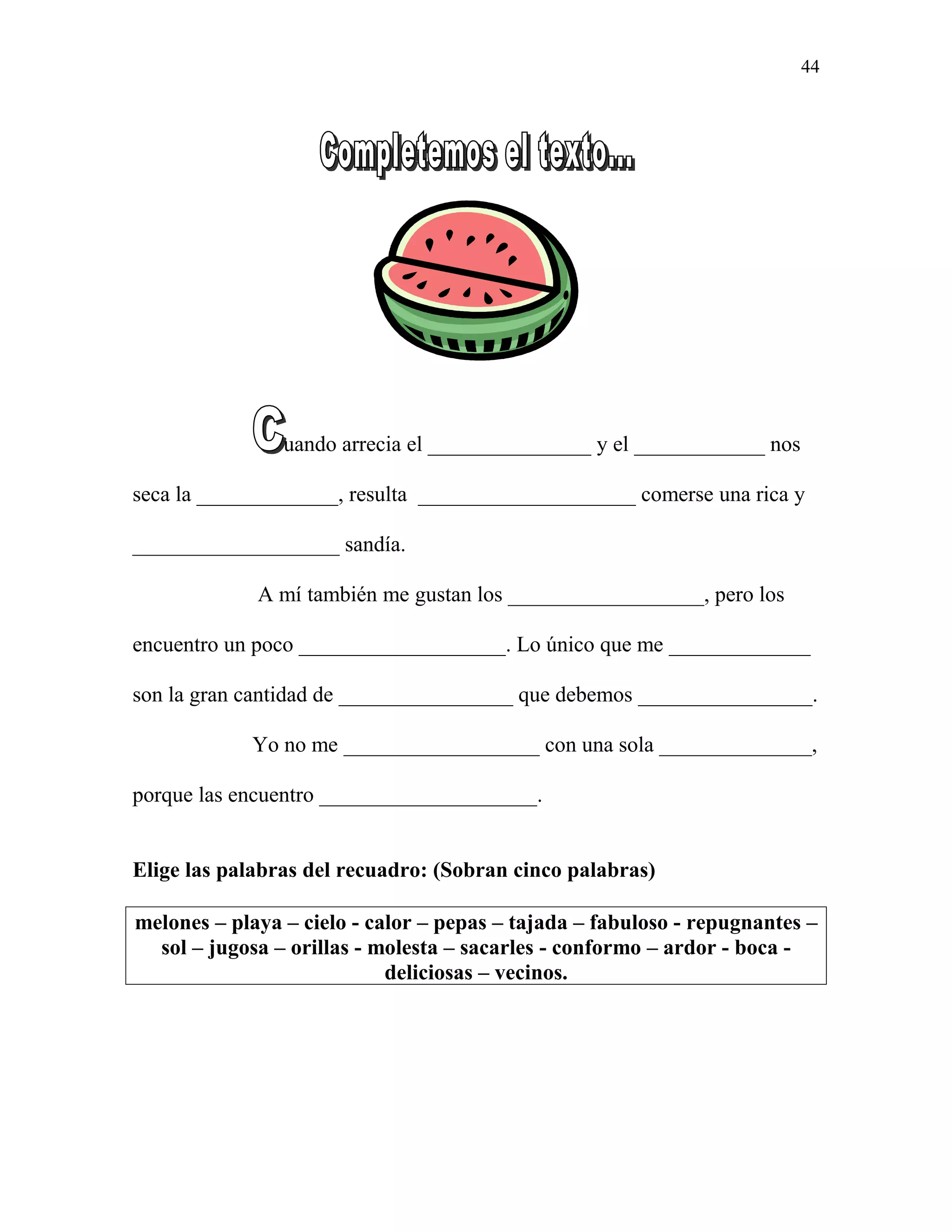El documento habla sobre las ventajas de comer sandía cuando hace calor, en comparación con los melones. Aunque también le gustan los melones, encuentra que tienen demasiadas pepas que sacar. Prefiere comerse una jugosa tajada de sandía en lugar de conformarse con una sola deliciosa porción de melón.