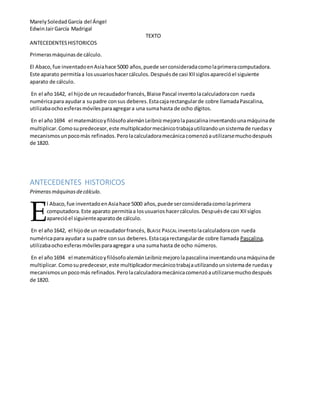 El documento resume los antecedentes históricos de las primeras máquinas de cálculo. Menciona que el ábaco, inventado en Asia hace 5000 años, fue considerada la primera computadora y permitía realizar cálculos. En 1642, Blaise Pascal inventó la calculadora con rueda numérica para ayudar a su padre, utilizando esferas móviles para sumar hasta ocho números. En 1694, Leibniz mejoró la máquina de Pascal inventando un multiplicador mecánico que usaba ruedas y mecanismos más ref