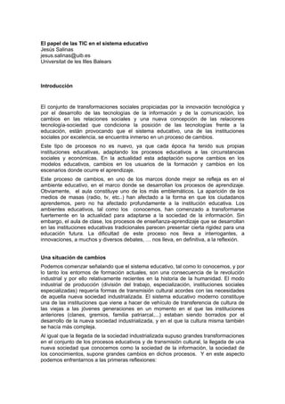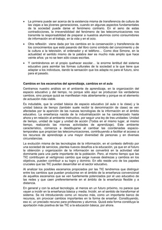 El documento describe el papel de las tecnologías de la información y la comunicación (TIC) en el sistema educativo. Explica que las TIC están provocando cambios en los modelos educativos, usuarios de la formación y escenarios de aprendizaje. También analiza cómo las TIC pueden afectar positivamente al aula a través de recursos en línea pero probablemente no cambiarán la enseñanza básica y media a corto plazo. Finalmente, discute cuatro escenarios potenciales para el aprendizaje con TIC: en casa