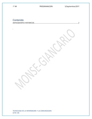 El documento describe los antecedentes históricos de las primeras máquinas de cálculo. Explica que el ábaco, inventado en Asia hace 5000 años, fue considerado la primera computadora ya que permitía realizar cálculos. Más tarde, en 1642 Blaise Pascal inventó la calculadora con rueda numérica llamada Pascalina para ayudar a su padre, la cual utilizaba esferas móviles para sumar hasta ocho cifras. En 1694, Wilhelm von Leibinz mejoró la Pascalina inventando una máquina de multiplicar con rued