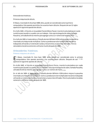 El documento resume los antecedentes históricos de las primeras máquinas de cálculo. El Abaco, inventado en Asia hace 5000 años, fue considerado la primera computadora. En 1642, Blaise Pascal inventó la calculadora con rueda numérica para ayudar a su padre. En 1694, Wilhelm Von Leibniz mejoró la máquina de Pascal inventando una máquina de multiplicar. Las calculadoras mecánicas no se utilizaron ampliamente hasta después de 1820.
