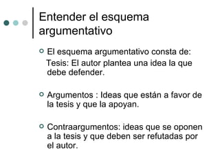 El documento explica la estructura de un texto argumentativo. Indica que debe tener una tesis central, argumentos a favor y contraargumentos refutados. Además, debe estar dividido en cinco párrafos con una introducción, cuerpo desarrollando los argumentos de uno en uno claramente, y una conclusión. Finalmente, recomienda evitar falacias y usar conectores y sinónimos para mejorar la claridad y fluidez del texto.