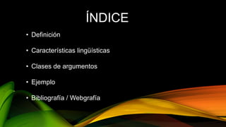 Este documento define el texto argumentativo y describe sus características lingüísticas y estructurales. Explica que un texto argumentativo intenta convencer a otros de una idea mediante razonamientos. Describe las características morfosintácticas, léxico-sintácticas y textuales de la argumentación científica frente a la argumentación subjetiva. Además, identifica diferentes clases de argumentos según su función y contenido, como argumentos de apoyo, contraargumentos, analógicos, lógicos y de autoridad. Finalmente, incluye