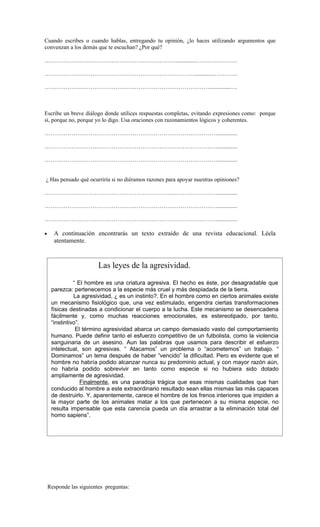 Este documento presenta una guía de aprendizaje para estudiantes sobre lenguaje y comunicación. Incluye situaciones de conversación y preguntas para analizar el uso de respuestas incompletas o sin fundamentos. También contiene un texto sobre la agresividad humana y preguntas para comprender y debatir la tesis planteada. El objetivo es enseñar a los estudiantes a comunicarse de forma clara usando argumentos lógicos.