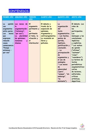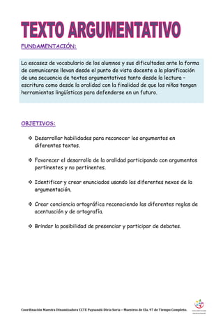 El documento presenta una secuencia didáctica para el desarrollo de habilidades argumentativas en estudiantes de primaria. La secuencia incluye actividades para los primeros seis años de primaria con el objetivo de que los estudiantes aprendan a reconocer y producir textos orales y escritos argumentativos usando diferentes conectores y recursos lingüísticos. Las actividades involucran el análisis de videos, debates, creación de historietas y foros de discusión.