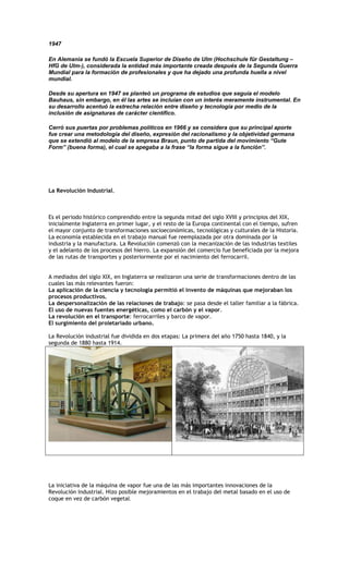 El documento resume los principales hitos en la evolución del diseño industrial desde principios del siglo XX hasta mediados del siglo XX. En 1909, Henry Ford introdujo la producción en masa de automóviles con su Modelo T, mientras que General Motors promovió el consumismo mediante la introducción anual de nuevos modelos. En 1919 se fundó la escuela Bauhaus en Alemania para conciliar arte e industria. En 1947 se estableció la Escuela de Diseño de Ulm, que enfatizó la relación entre diseño y tecnología.