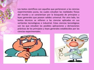 Los textos científicos se refieren a las ciencias experimentales puras que estudian las realidades físicas del mundo y buscan establecer principios y leyes universales, mientras que los textos técnicos se centran en las aplicaciones prácticas de dichos principios establecidos por las ciencias experimentales. Ambos tipos de textos se caracterizan por la claridad, precisión, verificabilidad, objetividad y uso de un lenguaje y métodos científicos universales.