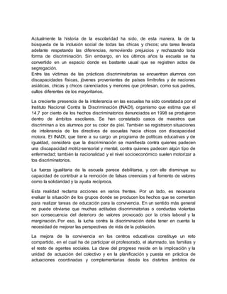La escuela debería ser un espacio de inclusión para todos los estudiantes, sin embargo, se han registrado actos de discriminación contra aquellos con discapacidades, de otros países o niveles socioeconómicos bajos. El Instituto Nacional Contra la Discriminación ha encontrado que el 14.7% de los casos denunciados de discriminación ocurren en escuelas. Para combatir la discriminación, se necesitan esfuerzos coordinados de maestros, estudiantes, familias y la comunidad para promover la convivencia a través de la educación y abordar