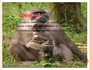 El documento describe diversas especies de monos, pertenecientes al orden de mamíferos primates, destacando sus características, reproducción y depredadores. Existen alrededor de 260 especies, que varían en tamaño y comportamiento, desde el mono nocturno hasta el mono aullador. Se menciona también la clasificación de algunos monos que generan controversia entre primates y simios.
