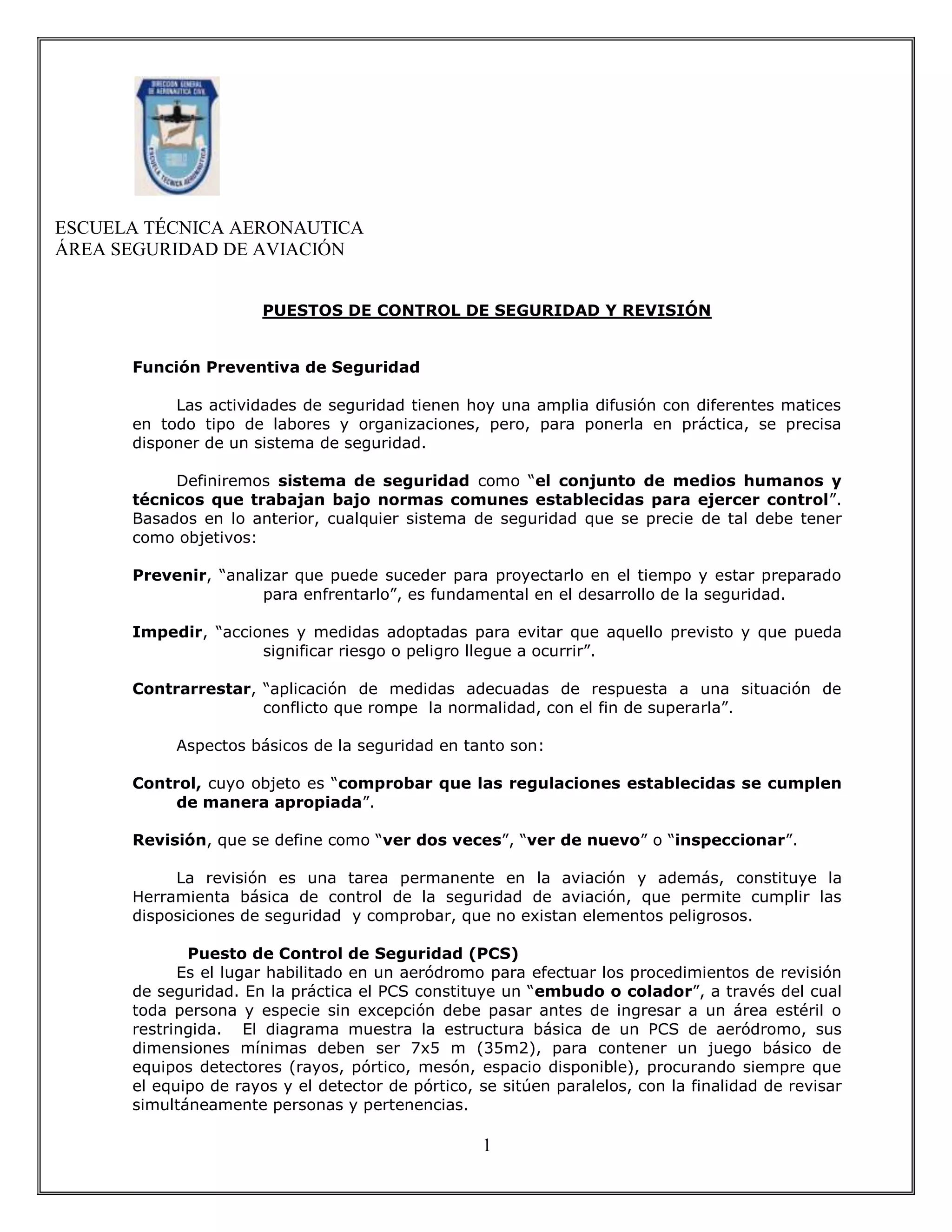 El documento describe la importancia de la seguridad en la aviación, detallando la función de los puestos de control de seguridad (PCS) y sus objetivos de prevenir, impedir y contrarrestar riesgos. Se enumeran los requisitos operativos de un PCS, incluyendo el personal capacitado y los equipos necesarios para llevar a cabo revisiones eficaces de seguridad, además de explicar los tipos de controles y la clasificación de las revisiones. Se destacan los artículos peligrosos que deben ser detectados y la necesidad de un enfoque riguroso para garantizar un ambiente seguro en los aeródromos.