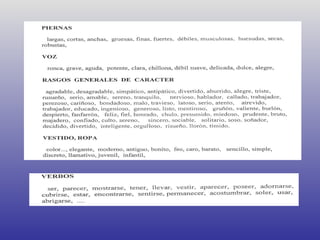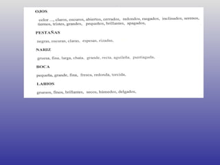 Este documento describe los elementos clave para realizar una descripción de personas, objetos y animales de manera detallada y ordenada. Explica que para describir algo hay que observarlo detenidamente, seleccionar sus aspectos más relevantes y ordenar la descripción. Luego entra en detalle sobre los diferentes tipos de descripciones como la prosopografía, etopeya y retrato para personas, y la topografía y características para objetos y animales. Proporciona ejemplos y detalles sobre los recursos estilísticos que se