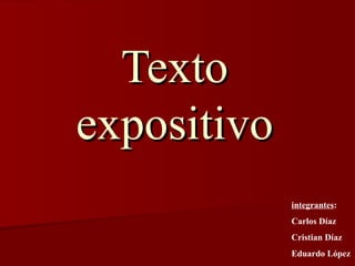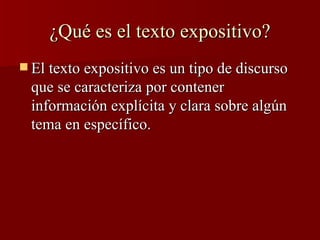 El texto expositivo es un tipo de discurso que tiene la función de informar sobre un tema de manera clara y explícita. Se compone de una introducción, un desarrollo y una conclusión. La introducción presenta el tema y propósito, el desarrollo ordena las ideas de manera lógica, y la conclusión recapitula lo más relevante. Los textos expositivos se encuentran comúnmente en libros científicos y artículos periodísticos.