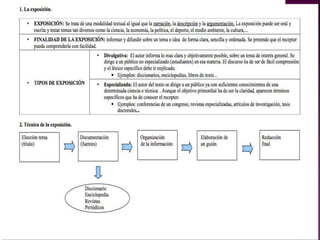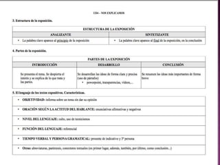 Este documento presenta la estructura básica de un texto expositivo. Comienza con un título que indica el tema, luego una introducción que contextualiza y define el tema. A continuación, se presenta el desarrollo con definiciones, causas, explicaciones y ejemplos. Finalmente, la conclusión sintetiza la información y resalta los aspectos fundamentales tratados.