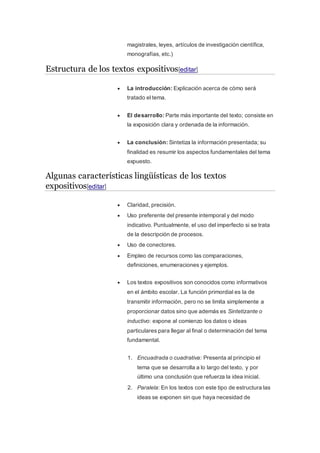 Este documento define y describe los textos expositivos. Explica que estos textos presentan de forma objetiva hechos, ideas y conceptos con el fin de informar a un público no especializado. Describe dos tipos de textos expositivos - divulgativos y especializados - y explica sus características. También resume las estructuras y recursos típicos que se utilizan en los textos expositivos para transmitir información de manera clara y ordenada.